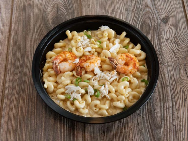 Three cheese blend macaroni and cheese with seared shrimp and crab meat